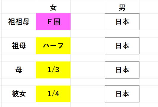 彼女はF国の系統はかなり薄まっているからか、100パーセント日本人にしか見えません。